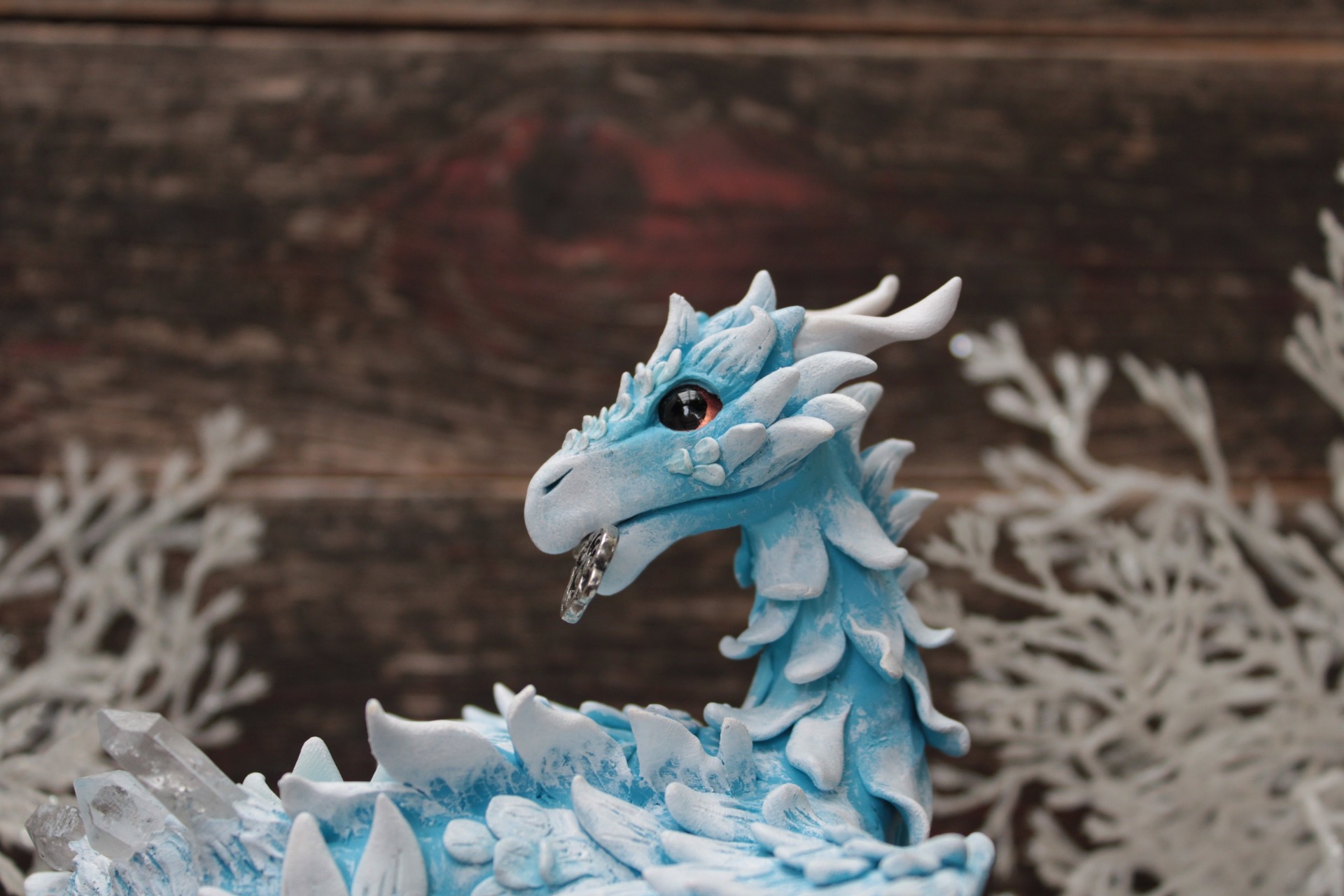 This detail adds a sense of mystery and storytelling to the piece — as if the dragon is guarding a secret, a hidden door, or an ancient winter treasure.